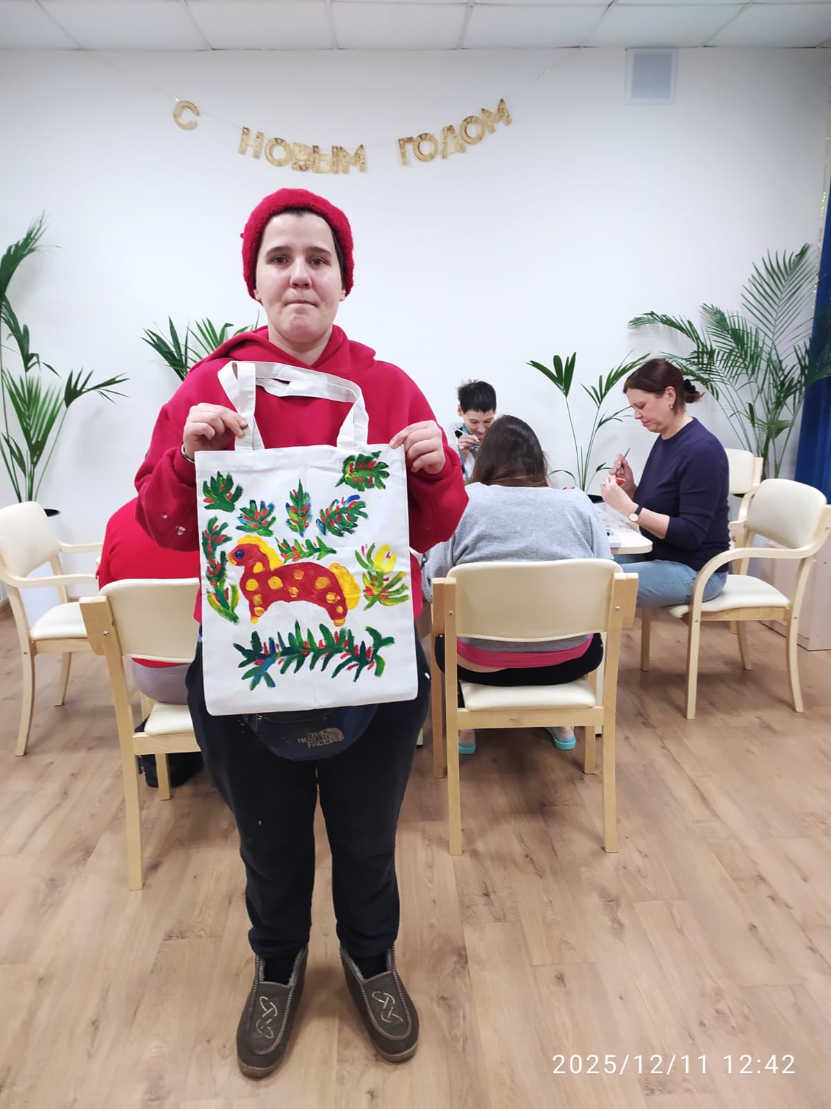 А еще Валя Л расписала холщовую сумку, было сложно, но справилась. Получилось очень красиво. А главное — сложился тандем — Катя Н сделала набросок карандашом, а Валя оживила картину и добавила своих ноток.